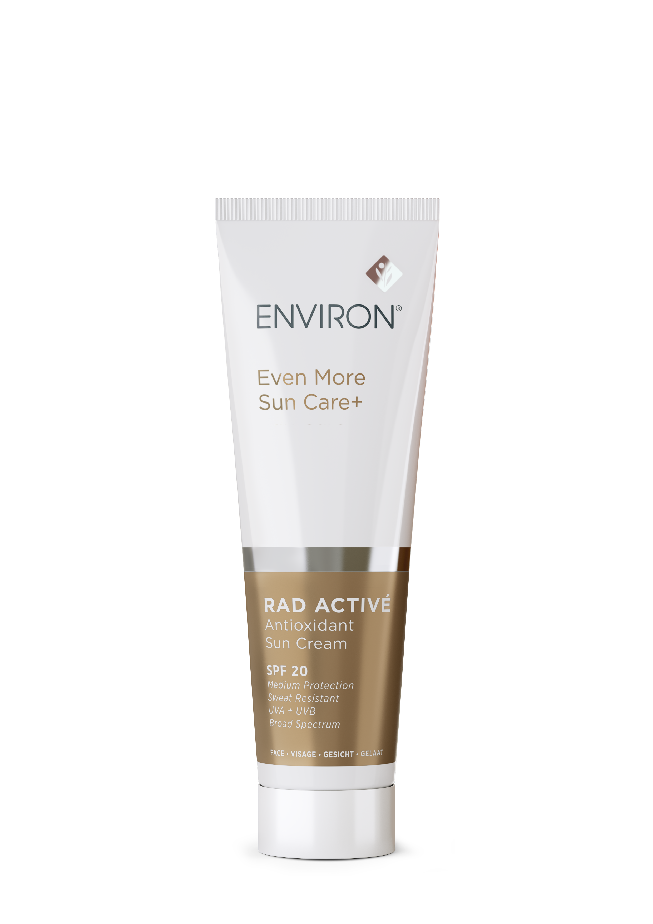 Environ Rad Activé Sun Cream beschermt je huid met SPF 20 breedspectrum UVA en UVB bescherming. Boordevol anti-oxidanten zoals beta-caroteen, vitamine C en E. Geeft een niet vettige, dewy finish. Het geeft een comfortabel, gehydrateerd gevoel op je huid en is geschikt voor alle huidtypes. Ook bij sportactiviteiten een fijne zonnebrandcreme omdat dit product een goede hechting aan de huid geeft.
